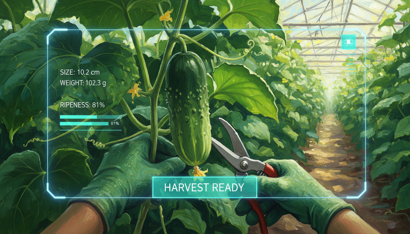 Für geübte Mitarbeiter:innen ist das meist kein Problem, der geschulte Blick erkennt die richtige Größe. Für neu anzulernende Mitarbeitende ist das aber ein umständlicher Prozess: die Gurke muss von der Pflanze geschnitten werden und an eine kleine Waage gehangen werden. Das kostet Zeit und wenn die Gurke noch zu leicht war, ist sie jetzt trotzdem von der Pflanze geschnitten.