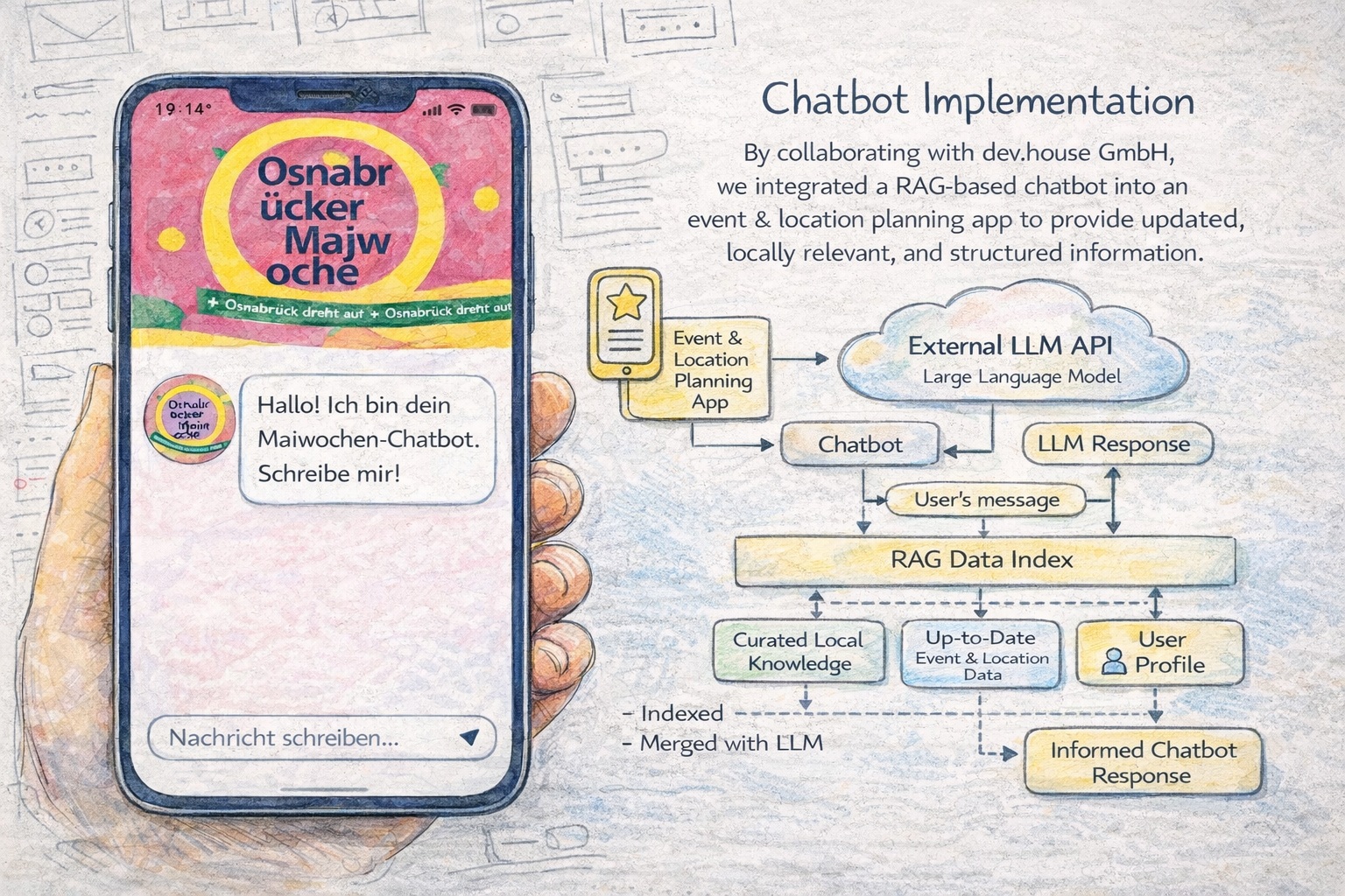 IT-Servicedienstleister wie die dev.house GmbH stehen zunehmend vor der Frage, welche Funktionen moderne Apps enthalten sollten. Gerade in einer Zeit, in der KI und Chatbots weit verbreitet sind, liegt es nahe zu prüfen, inwiefern solche Technologien auch in spezifische Anwendungen integriert werden können. Da das Unternehmen mit der Entwicklung der Maiwochen-App beschäftigt ist, wurde hier die Möglichkeit gesehen, diese Tools zu integrieren. Diese App soll Nutzer:innen vor allem strukturierte Informationen zu Events, wichtigen Standorten und Essensangeboten bieten. Doch die Nutzung gängiger Online-Dienste wie ChatGPT ist hier nur bedingt sinnvoll, denn diesen fehlen lokales Wissen, aktuelle Eventdaten und das Wissen über kurzfristige Programmänderungen.