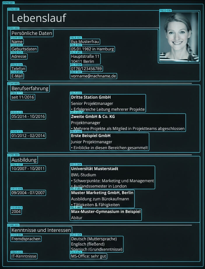 CITAH entwickelte daher einen prototypischen Lebenslauf-Parser. Dieser kann Lebensläufe, Anschreiben und Zeugnisse einlesen und verarbeiten. Mithilfe von Modellen für optische Zeichenerkennung (OCR), Textextraktion und großen Sprachmodellen werden die relevanten Informationen in den Dokumenten identifiziert und in einem strukturierten Datenformat ausgegeben. Dieses Format lässt sich anschließend problemlos in die IT-Infrastruktur einspeisen und weiterverarbeiten. Darauf aufbauend haben wir einen weiteren Prototyp entwickelt, der die extrahierten Daten klassifiziert und auf einem Zeitstrahl visualisiert.