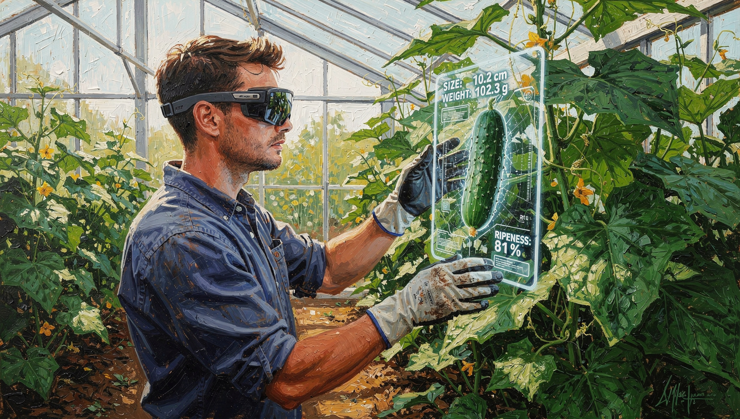 CITAH entwickelte hier nun den Prototyp einer Augmented Reality Lösung die den Prozess erleichtern soll. Eine kleine AR-Brille filmt die Pflanzen im Sichtfeld des Mitarbeitenden, ein von uns trainiertes KI-Modell identifiziert die Gurken und mithilfe eines Abstandssensors errechnen wir die Größe und daraus eine Abschätzung des Gewichts. Ein kleines Display zeigt dem Mitarbeitenden dann in Echtzeit das geschätzte Gewicht der Gurke, direkt an der Pflanze.
